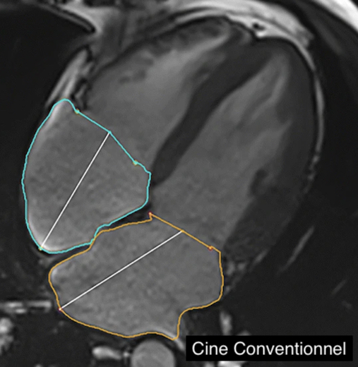 Les séquences ciné d’IRM cardiaque conventionnelles peuvent être sujette à des artefacts dus à des battements cardiaques irréguliers et être chronophages car plusieurs battements cardiaques sont nécessaires pour rassembler toutes les données requises. Ces contraintes sont en partie éliminées depuis l’apparition des techniques d'acquisition hautement accélérées, telles que le Compressed Sensing (CS) qui réduisent le temps d’acquisition de manière significative. Ainsi, en utilisant une méthode ciné basée sur le CS, une évaluation volumétrique complète du cœur est réalisable en une seule apnée.