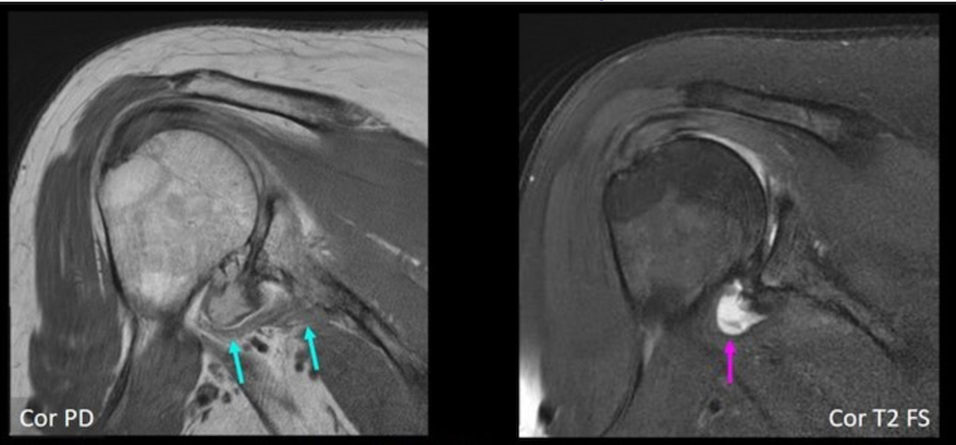 L'AIGM a été observé chez 89/100 patients atteints de TMFI ; 30/100 chez les patients sans TMFI. Dans tous les cas, l’AIGM provenait du col glénoïde inférieur et était inséré sur le col huméral/diaphyse humérale proximale. La marge inférieure de l'AIGM chez les patients atteints de TMFI touchait le nerf axillaire chez 39 patients (46 %), avec un signal anormal chez 23 d’entre eux (27 %).